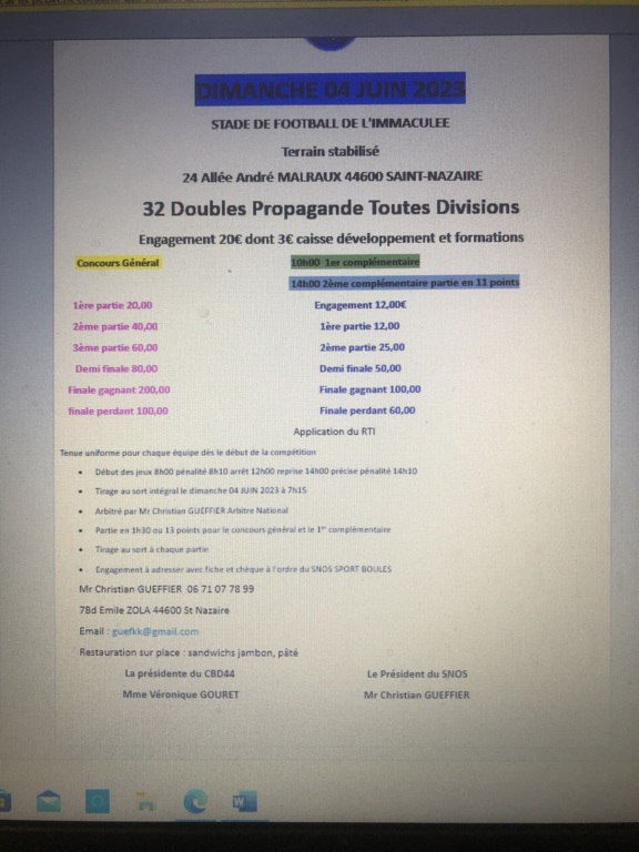 Le Club de Saint Nazaire organise un 32 doublettes T.D. propagande le dimanche 4 juin. Ci joint l'affiche.