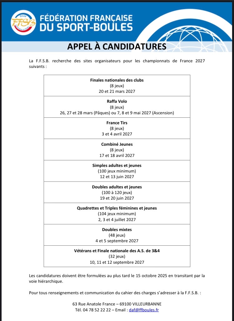 Pour information, les dates des championnats de France 2027. Les championnats simples et doubles sont avancés en juin et les quadrettes début juillet.