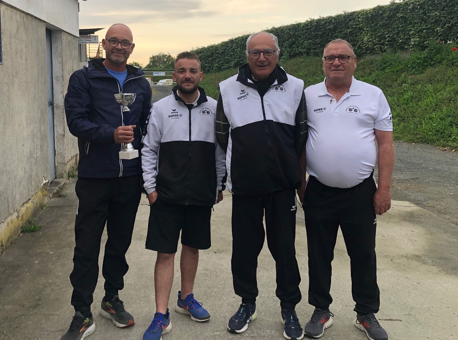 Bravo aux équipes LogeaisMaxime/Pras Bruno et Galarneau Noel/Cantet Luc qui se sont retrouvées Finalistes du Championnat de Vendée Doublettes M4 ce dimanche 4 mai à Luçon. L'équipe de Maxime et Bruno est Championne Départementale ( à la pièce ).