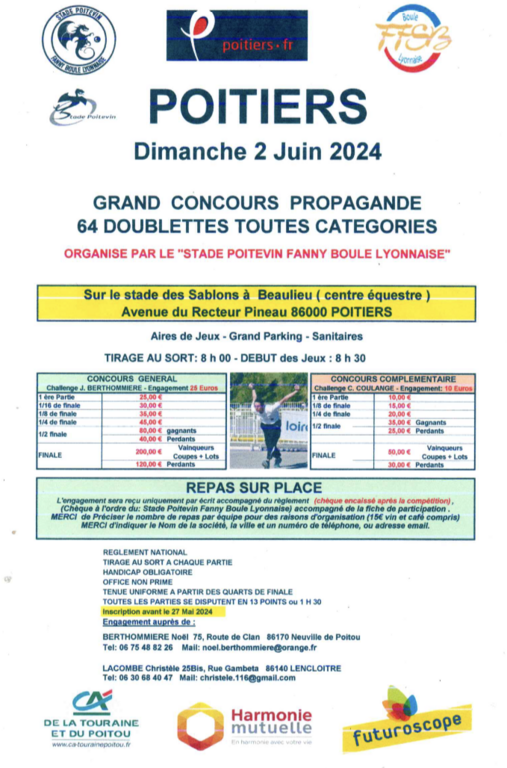 Ci joint l'affiche du concours 64 Doublettes de Poitiers. Notre ami Noel Berthomière ( Nono ) compte sur vous ! à vos inscriptions !