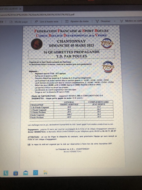 Bonjour les points du dernier concours de Chantonnay en oct 22 n'ont pas été enregistrés sur le logiciel BOULY de la fédé ce qui fausse les classements des joueurs pour la montée en 3°, pouvez vous vous renseigner auprès de votre président de votre CBD? Merci d'avance