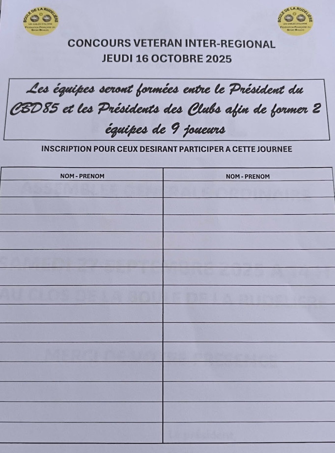 Le 16 octobre la Boule de la Rudeliere va organiser le Challenge Régional Vétérans inter départements. 4 formations de 9 joueurs et joueuses, dont 1 Sarthoise, 2 Vendéennes et 1 de Loire Atlantique vont s'affronter au cours de la journée en divers matchs et ciblés. L' équipe Vendéenne est tenante du dernier trophée, il va falloir tout faire pour que celui ci reste chez nous !