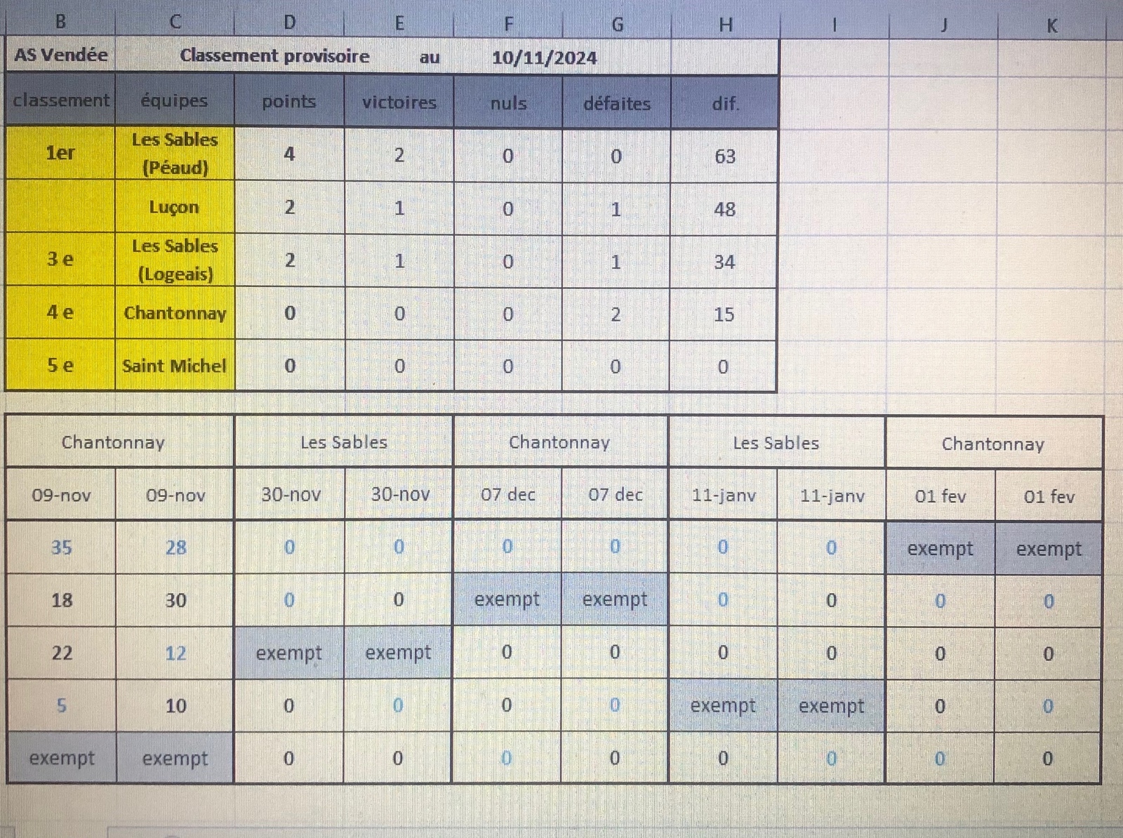 Voici le tableau des AS dans lequel vous trouverez le classement à date ainsi que les prochaines journées à venir. A la fin des 5 journées de compétitions, les 2 premières équipes au classement seront qualifiées pour la finale départementale le 22 février 2025. Le lieu restant à définir ( les Sables ou Chantonnay).