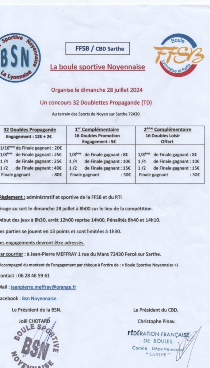 Ci joint l'affiche du 32 D. le 28 juillet 2024 Organisé par le Club de Noyen.