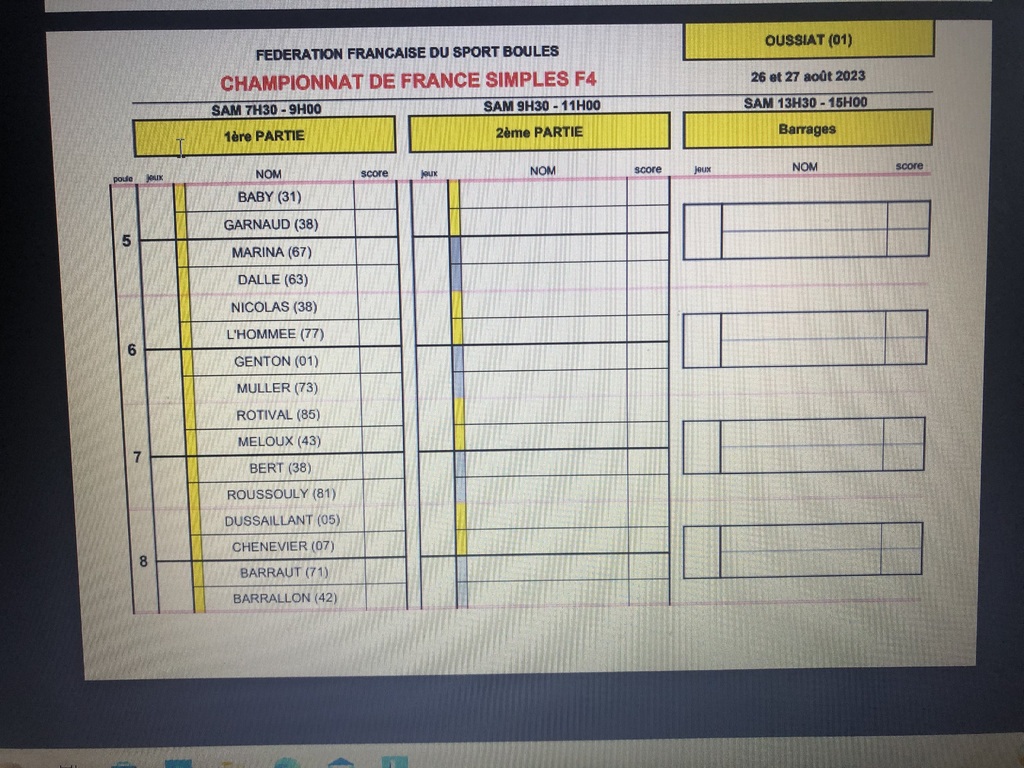 Florence est en route pour le Championnat de France . Ci-joint la poule et les horaires de celle ci. Début Samedi 7 h30. Bonne Route et m....!