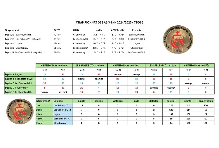 Et pourquoi pas les 2 équipes Sablaises en finale départementale des A.S. Clubs ? Samedi 1er février, Maxime logeais et son équipe vont tenter de gagner leur billet pour la finale Vendéenne du 22 février. Avant les 2 rencontres de la journée ( Chantonnay puis Saint Michel ) ils sont bien positionnés avec la 2e place au classement provisoire, juste devant l'équipe Luçonnaise, en embuscade. On y croit, on est avec vous !