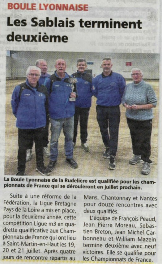 En photo l'article de presse paru dans le journal des Sables la semaine passée sur la qualification de l'équipe Sablaise au Championnat de France.