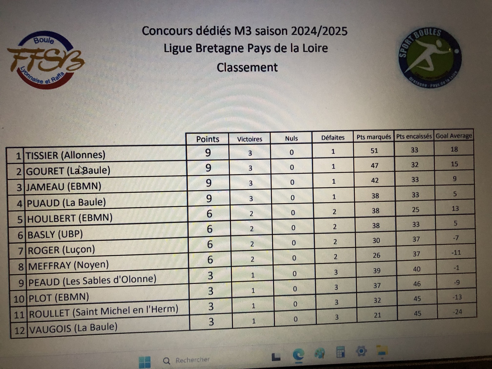 2eme journée ligue M3 ce dimanche 19 janvier 2025 au Boulodrome de Chantonnay. Les Sablais ( l'équipe Péaud), actuels 9 èmes du classement provisoire, devrons éviter les faux pas pour espérer se repositionner dans la course à la qualification pour le Championnat de France avant la dernière journée du 16 Février au Mans. En photo les rencontres de la journée et le classement.