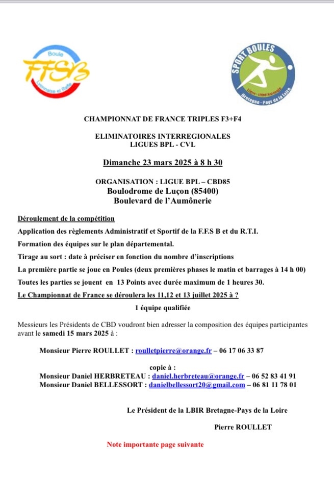 Attention : le nouveau règlement ne permet pas de participer à la fois à l'éliminatoire Triples F3/F4 et à l'éliminatoire Quadrettes M3/M4 !